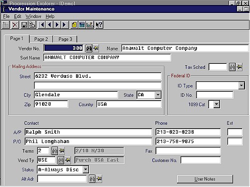 Vendor and account information can be displayed on-screen with the click of a button, and Vendor Performance information is just a report away. But what does all of this mean to you?It means that your company doesn't have to miss taking discounts; that you can track and manage vendors with poor performance; that bills which occur on a recurring basis (such as rent, electricity, etc.) can be handled easily; and that check printing problems can be reduced to a minimum.All in all, it means that your Accounts Payable functions just got easier with V7.6 Progression Series A/P!