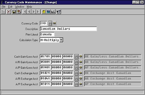 A currency Code is a 3-character code that signifies which currency code is being used. With Exact Progression's C/M module you can have an unlimited number of currency codes when processing your business transactions. When entering each currency code you also enter the gain/loss accounts for cash, A/R and A/P. Those accounts will then be used whenever a transaction is entered for that particular currency code.