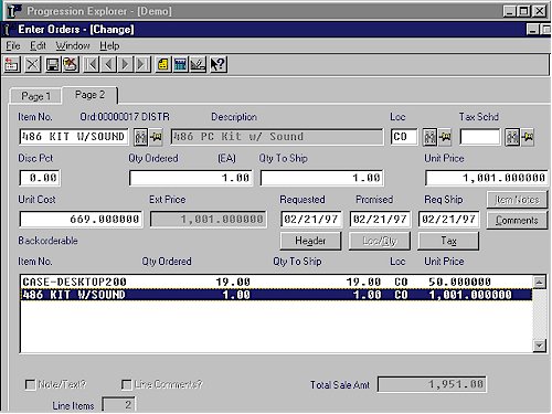 Processing customer orders is one of the most critical functions in any distribution and manufacturing business. Order entry and fulfillment must be done in a streamlined fashion, accuracy must be high, and the goods must be delivered where and when requested. Your customer service function needs the power and flexibility of Progression's Order Entry (O/E) module. When you run O/E with the Accounts Receivable (A/R) and Inventory Management (I/M) modules, you will streamline every step of your order process, increasing customer service levels and reducing inventory. O/E supports the three primary phases of order processing. It facilitates the order entry process, accepting orders and quotes, validating credit, and calculating pricing. It supports the picking and shipping process by recommending order lines, serial/lot/bins to be picked, and generating shipping documents such as labels, packing slips and bills of lading. Finally, it supports the billing process, closing the loop between customer service, the warehouse, and accounting. O/E accommodates numerous types of orders, feature/option bills, kit items, stocked items, and non-inventory service charges. And O/E's "on-the-fly" feature enables you to add or change customer and inventory information for streamlined entry and increased productivity during the order process.