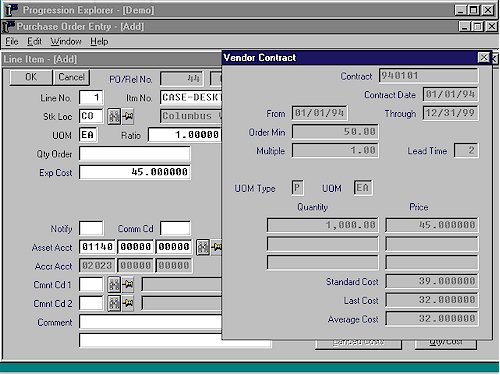 P/O enables you to analyze the quality, accuracy, and timely delivery of all purchased materials. P/O's capabilities make it a must within both the manufacturing and distribution environments. It predicts cash requirements, monitors vendor performance, and allows you to keep inventory levels low while alerting you to material shortages. And when you combine P/O with Progression's Accounts Payable (A/P) and Inventory Management (I/M) packages, you have a comprehensive system that optimizes timely purchases with the dynamics of inventory control.