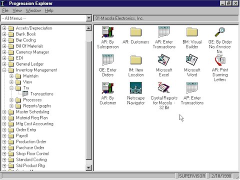 A 32-bit Windows-based product, the Progression Series exploits all the robust feature sets found in the most popular operating systems available, Microsoft Windows 95 and Windows NT. Progression also uses the advanced memory management options native to 32-bit operating systems. Desktop Integration Progression V7.7 includes support for DDE (Dynamic Data Exchange) allowing Progression to share information with a variety of other business applications, including the Microsoft Office suite of products. The Exact Progression solution also offers you a choice of industry-leading reporting tools such as Crystal Reports, F9, and FRx, giving you up-to-the-minute access to the data you need to run your company.